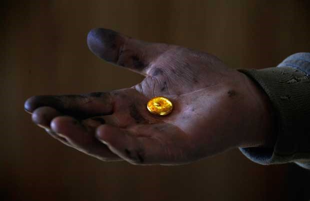 Um mineiro mostra o seu ouro, já após ser derretido e processado numa fábrica local David Gray/Reuters