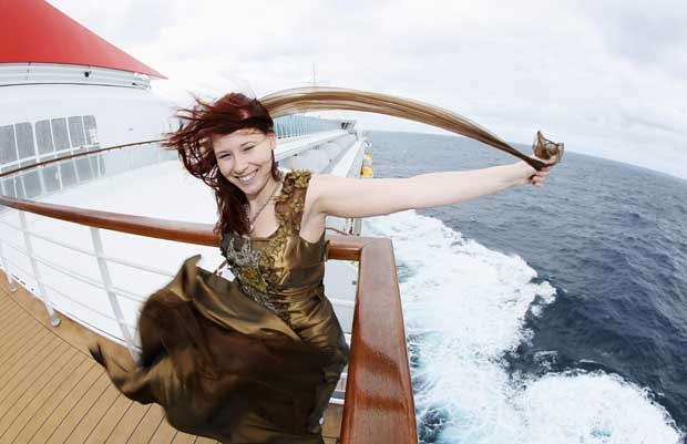 Uma passageira, Anais Verbraeken da Bélgica, como um vestido copiado do usado pela actriz Kate Winslet no filme "Titanic" Chris Helgren/Reuters