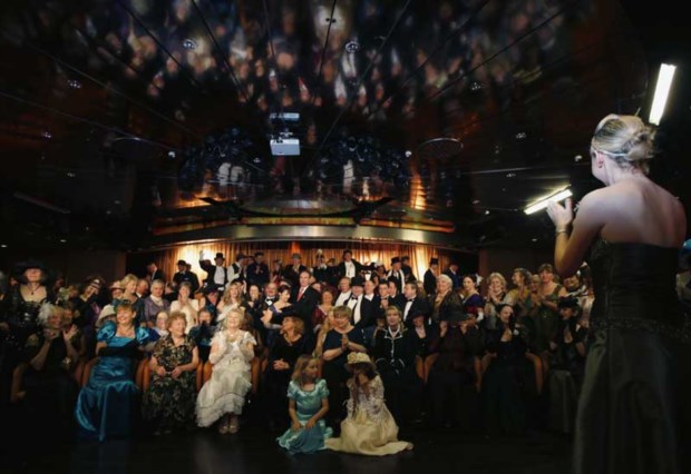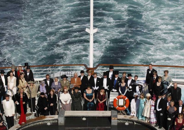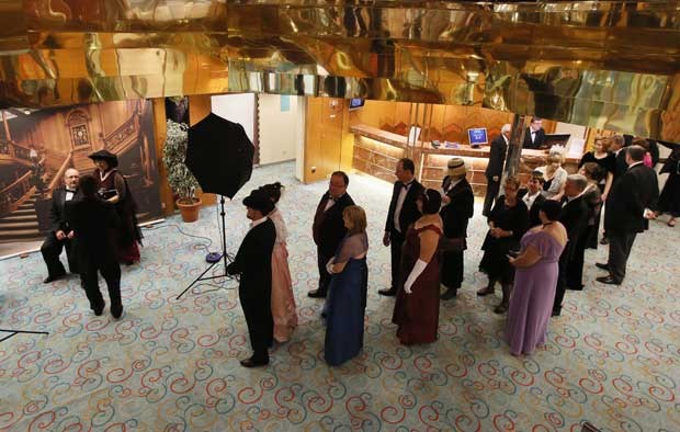 Foto de grupo dos passageiros, vestidos a rigor como no início do séc. XX Chris Helgren/Reuters