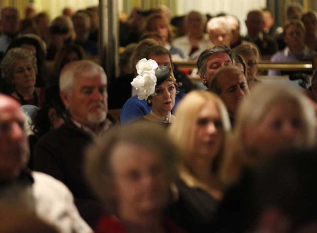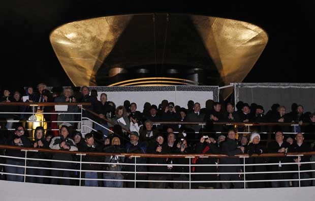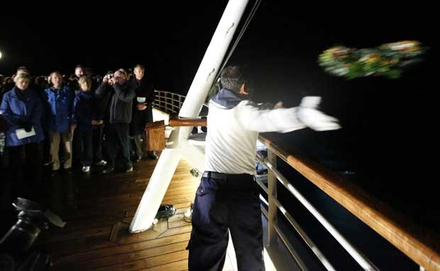 Durante um serviço religioso em homenagem às vítimas do naufrágio, no ponto onde o navio afundou Chris Helgren/Reuters