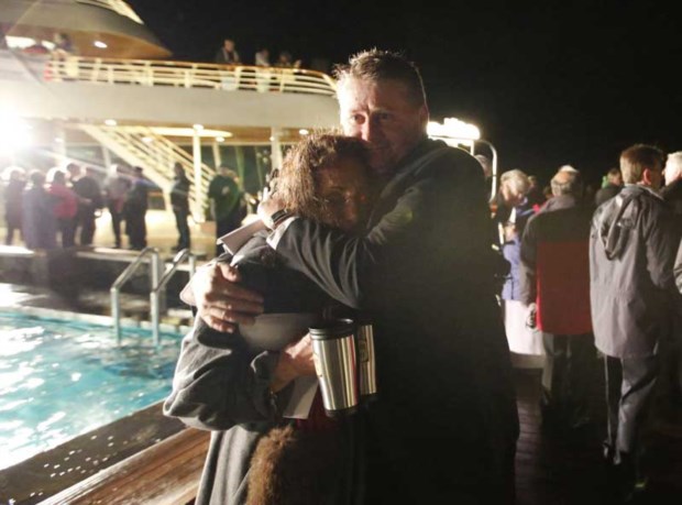 Um abraço após a cerimónia de homenagem às vítimas do naufrágio Chris Helgren/Reuters