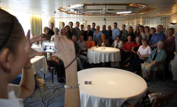 Foto de grupo de descendentes de sobreviventes e vítimas do naufrágio durante um encontro informal a bordo do "cruzeiro Titanic" Chris Helgren/Reuters