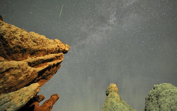 Um meteoro cruza o céu sobre Kuklici (Macedónia), zona célebre pelas centenas de rochas cujos recortes lhes parecem dar traços humanos. 13/08/2012 Ognen Teofilovski/Reuters