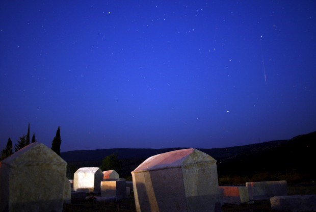 Um meteoro cruza o céu sobre Kuklici (Macedónia), zona célebre pelas centenas de rochas cujos recortes lhes parecem dar traços humanos. 13/08/2011 Ognen Teofilovski/Reuters