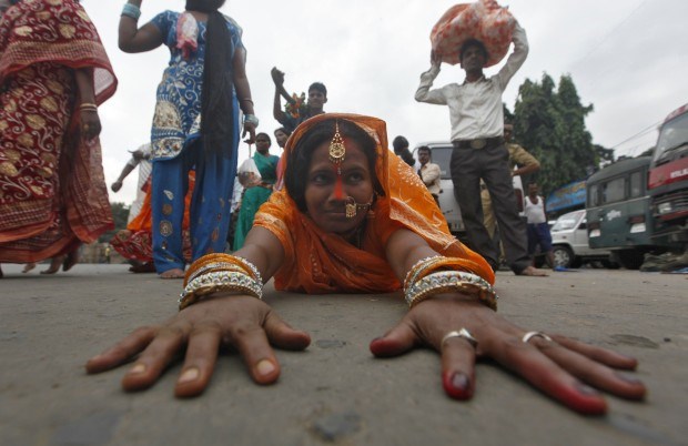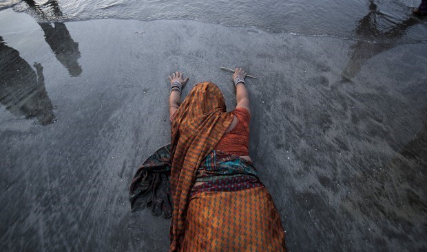Uma devota deita-se no areal junto ao mar Arábico, em Mumbai Vivek Prakash / Reuters