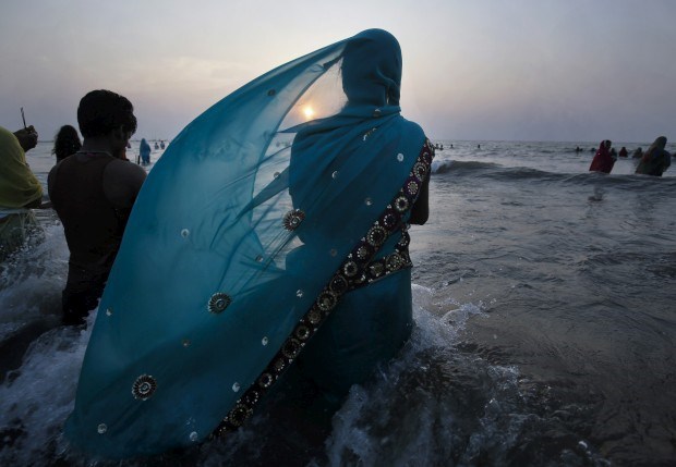 Uma devota reza enquanto se banha no mar Arábico, em Mumbai Vivek Prakash / Reuters