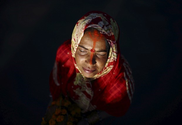 Uma devota em oração ao deus Sol, em Katmandu Navesh Chitrakar / Reuters