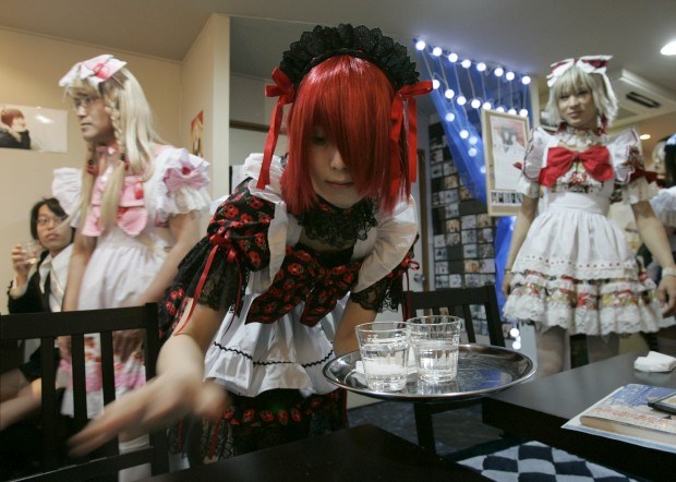 Dois empregados, vestidos de estudante e professora de colégio, no café Edelstein, em Tóquio. Mas a "professora" não larga os seus livros de banda desenhada homoerótica e o estudante não sai à rua sem gloss... Só se estuda uma matéria: como servir as clientes de forma satisfatória. É tudo baseado em universos de fantasia e erotismo manga... É um exemplo da abertura contínua de sítios no Japão todos baseados em fantasias e inspirados na BD. Toru Hanai/Reuter