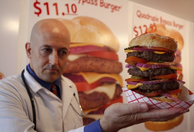 Bem-vindos ao "Heart Attack Grill". Especialidade: hambúrgueres que "prometem" causar os mais diversos problemas à sua saúde. A escolha é sua. Chovem críticas, não faltam clientes. Aqui, o proprietário, Jon, mostra um quadrúplo cheeseburger que se vende sob o mote "bypass". Pelo menos dois clientes já tiveram, de facto, ataques cardíacos no local. Um contador conta, precisamente, os milhões de calorias já servidas... Joshua Lott/Reuters