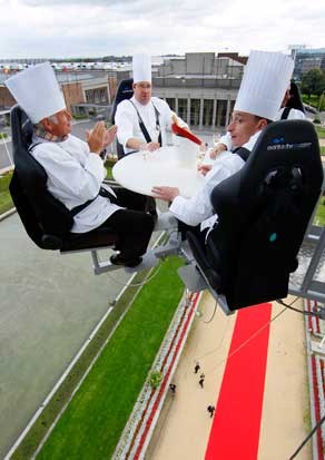 Dinner in the Sky é o nome do projecto e continua a viajar por todo o mundo, tendo até já passado por Portugal. É um restaurante absolutamente aéreo: a mesa é elevada a uns 50m de altura e serve umas duas dezenas de pessoas. Aqui, a refeição era especial, servida a 22 chefs belgas sobre Bruxelas. François Lenoir/Reuters
