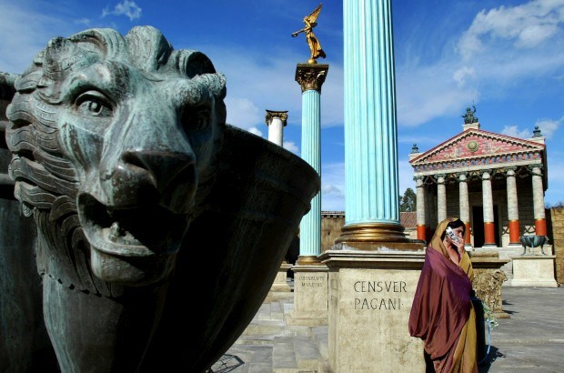 Uma actriz, vestida como na Roma Antiga, conversa ao telemóvel durante uma pausa das gravações da série "Roma" (na Cinecittà) Stefano Rellandini/Reuters