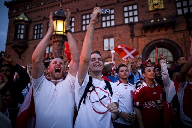 Os sempre bem dispostos adeptos dinamarqueses em dia de futebol no centro de Copenhaga