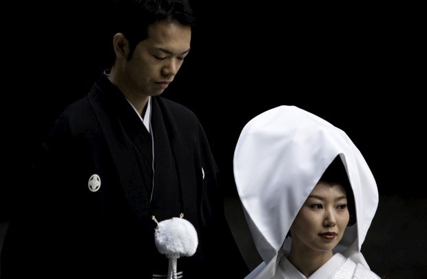 Casal de noivos durante a sua sessão fotográfica, em Tóquio