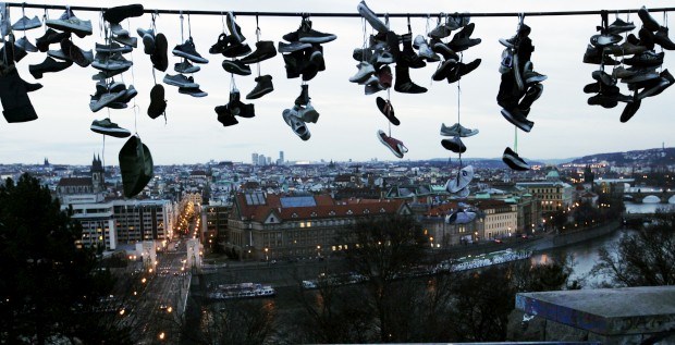REPÚBLICA CHECA, 2.1.2013. A linha de sapatos em fio eléctrico no parque Letna, com Praga no horizonte Petr Josek/Reuters