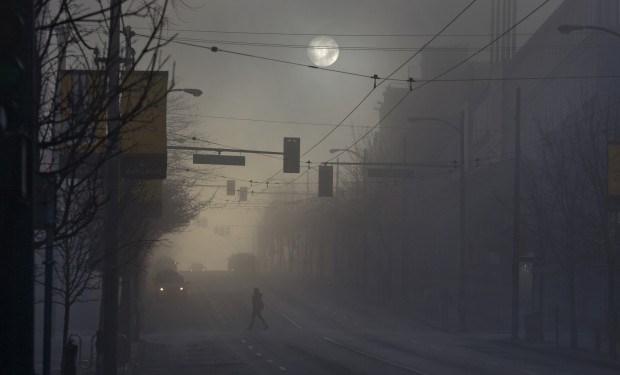 CANADÁ, 3.1.2013. Nascer do sol sob intenso nevoeiro em Vancouver Andy Clark/Reuters