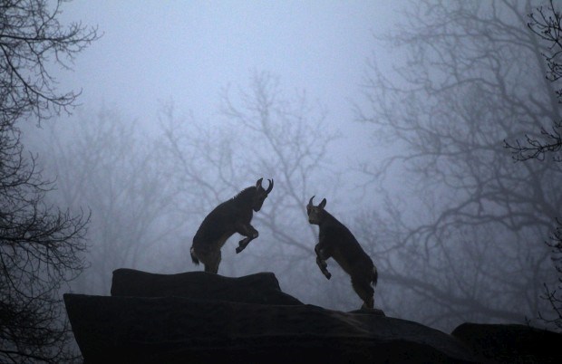 ALEMANHA, 4.1.2013. Cabras montanhesas em jogo de luta no zoo de Wuppertal Ina Fassbender/Reuters