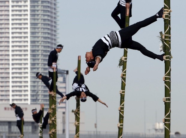 JAPÃO, 6.1.2013. Membros da associação Edo para a prevenção de fogos exibem os seus dotes de ginastas numa demonstração de ano novo dos bombeiros de Tóquio Toru Hanai/Reuters
