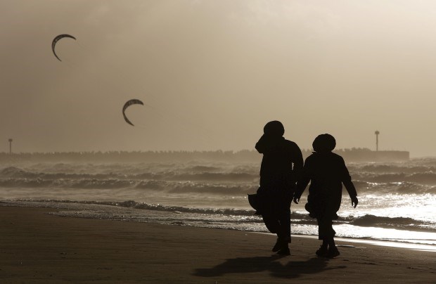 ISRAEL, 7.1.2013. Duas mulheres da comunidade de judeus ultra-ortodoxos caminham à beira-mar durante um dia de tempestade em Ashdod Amir Cohen/Reuters
