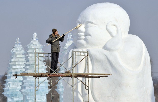 CHINA, 10.1.2013. A polir uma estátua do festival de neve e gelo de Shenyang Reuters