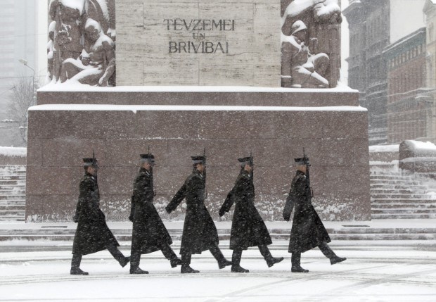LETÓNIA, 10.1.2013. Guarda de honra marcha perto do Monumento à Liberdade durante uma tempestade de neve em Riga Ints Kalnins/Reuters