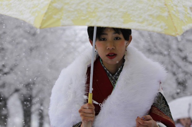 JAPÃO, 14.1.2013. Uma japonesa em quimono numa cerimónia tradicional dedicada aos jovens que passam a adultos quando atingem os 20 anos. No parque Toshimaen, numa Tóquio sob nevão Yuya Shino/Reuters