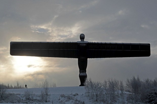 REINO UNIDO, 15.01.2013. Um homem caminha pela neve junto à escultura Anjo do Norte, que observa as cidades de Gateshead, Tyne e Wear Lindsey Parnaby/AFP