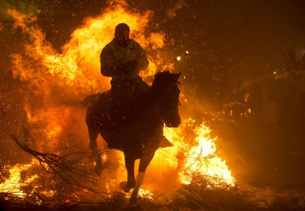 ESPANHA, 16.01.2013. Um cavaleiro salta com o seu cavalo sobre uma fogueira em San Bartolomé de Pinares, na abertura das festas de Santo António, patrono local dos animais Pierre-Philippe Marcou/AFP