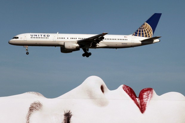 EUA, 17.01.2013. Um Boeing 787 Dreamliner da United Airlines passa sobre um anúncio em Los Angeles na aproximação ao aeroporto internacional da cidade David McNew/Getty Images/AFP