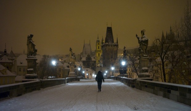 R. CHECA, 18.01.2013. Pela neve, na ponte medieval Carlos em Praga Michal Cizek/AFP