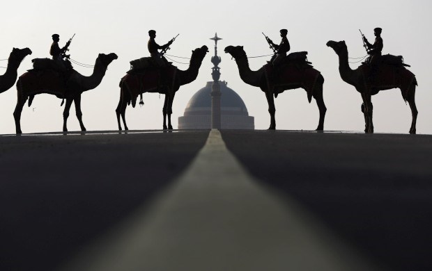 ÍNDIA, 19.01.2013. A força de defesa da fronteira nos seus camelos frente ao palácio presidencial Rashtrapati Bhavan, em Nova Deli, durante as comemorações do Dia da República Indiana Adnan Abidi/Reuters