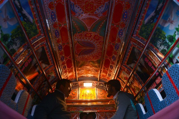 PAQUISTÃO, 20.01.2013. Viagem numa das carrinhas tradicionalmente decoradas, em Rawalpindi. Autocarros, carrinhas e muitos mais veículos são decorados profusamente Asif Hassan/AFP