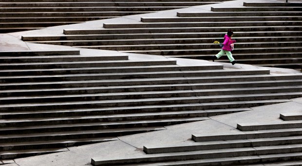 CANADÁ, 7.02.2013. Uma rapariga corre por escadas desenhadas para facilitar a movimentação de cidadãos em cadeiras de rodas. Em Vancouver. Andy Clark/Reuters