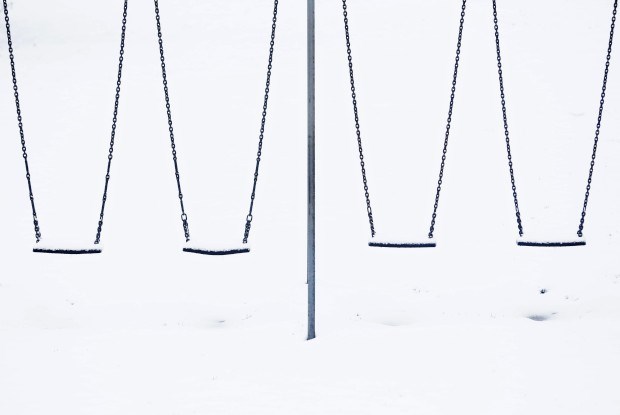 REINO UNIDO, 11.02.2013. Beleza geomética: baloiços aguardam as crianças num parque nevado em Lyminge Luke MacGregor/Reuters