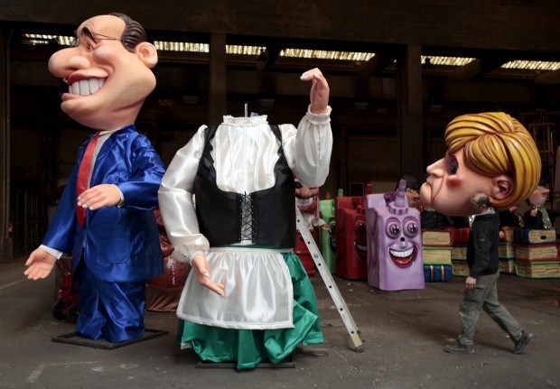FRANÇA, 12.02.2013. No Carnaval de Nice. Um trabalhador carrega a cabeça de uma figura gigante que representa Angela Merkel para ao pé da figura do primeiro-ministro francês, Hollande. Eric Gaillard/Reuters