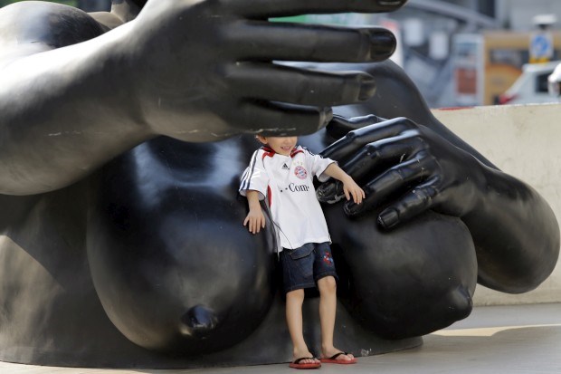 TAILÂNDIA; 27.02.2013. Um rapaz posa para a foto em frente a uma estátua no Centro de Arte e Cultura de Banguecoque Jason Lee/Reuters