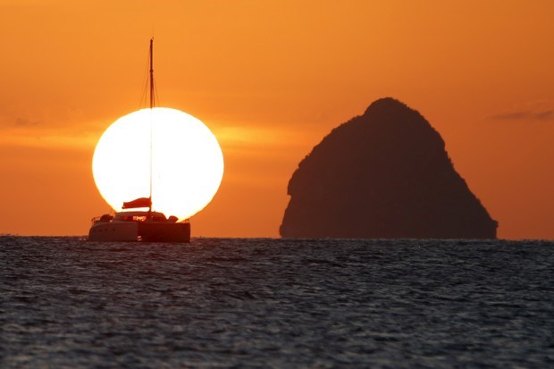 MARTINICA, 13.03.2013. O postal perfeito: foto captada ao pôr-do-sol na Martinica com um barco à vela perto de um icónico Rochedo do Diamante (Rocher du diamand) Charles Platiau/Reuters