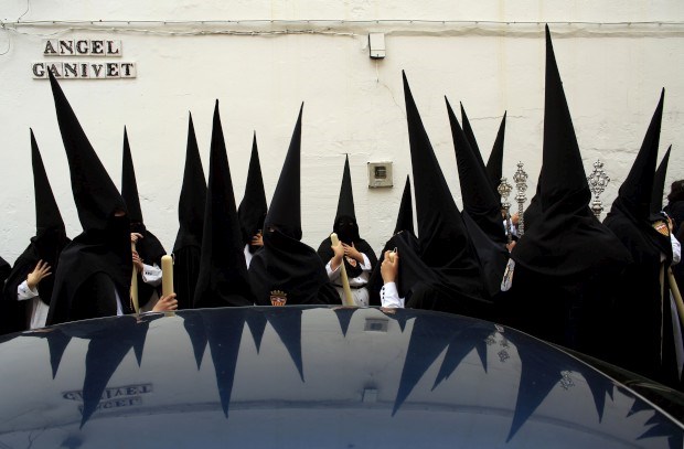 ESPANHA, 25.03.2013. Penitentes aguardam para participar na procissão de Santa Genoveva durante a Semana Santa em Sevilha Marcelo del Pozo/Reuters