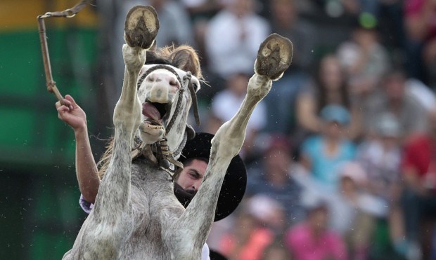 URUGUAI, 25.03.2013. Um gaúcho cavalga um cavalo por domesticar no festival anual Criolla Andres Stapff/Reuters