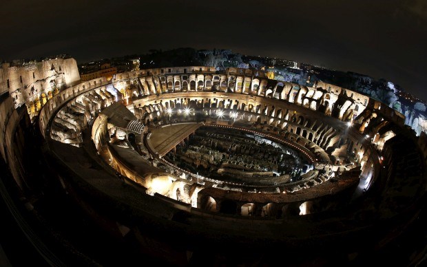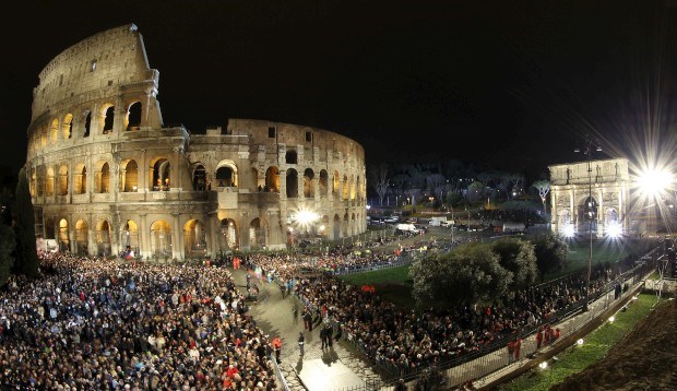 ITÁLIA, 29.03.2013. O Coliseu de Roma em noite de Via Crucis, procissão que reconstrói os passos de Cristo rumo à cruz. Tony Gentile/Reuters