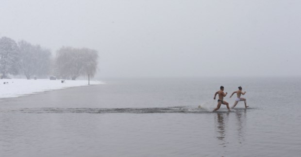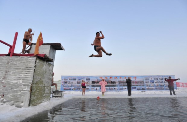 CHINA, 28.12.2013. Um mergulho no Inverno: no parcialmente gelado rio Songhua, em Harbin, onde decorre em Janeiro um dos maiores festivais de gelo e neve do mundo. Temperatura: -21ºC Sheng Li/Reuters