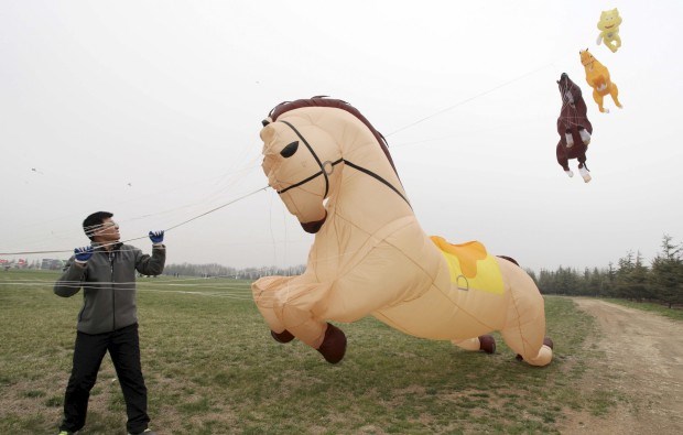 CHINA, 16.04.2013. O papapagaio-cavalo chamou as atenções numa feira de papagaios em Weifang, Shandong. Reuters