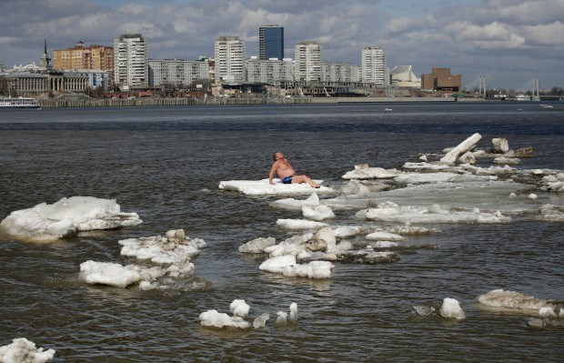 RÚSSIA, 26.04.2013. Nada como um banho de sol no gelo da Sibéria. Se duvida, pergunte ao sr. Vladimir Samsonov, da cidade de Zheleznogorsk, membro de um clube de natação de Inverno. No rio Yenisei Ilya Naymushin / Reuters