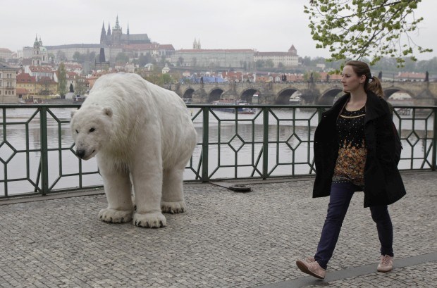 REPÚBLICA CHECA, 29.04.2013. Um urso em Praga: no caso, um activista do Greenpeace com fato de urso polar, participante numa campanha pela defesa do Ártico David W Cerny/Reuters