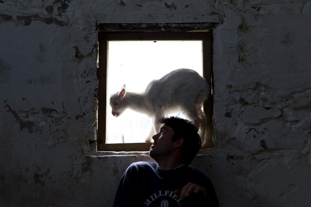 IRLANDA DO NORTE, 30.05.2013. Um criador de caprinos (da quinta Broughgammon, perto de Ballycastle) e um cabritinho saltitão com vontade de ver o mundo Cathal McNaughton/Reuters