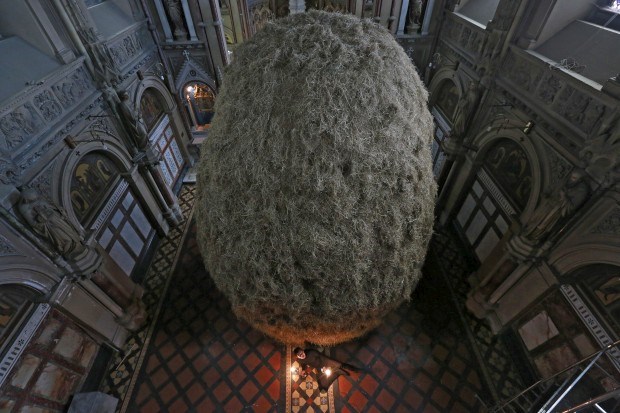 IRLANDA, 1.05.2013. O escultor irlandês Patrick O'Reilly posa com a sua mais recente peça, 'Haystack' (meda de feno). O local é o seu... estúdio: um mosteiro desconsagrado, St. Alphonsus (Dublin) Cathal McNaughton/Reuters
