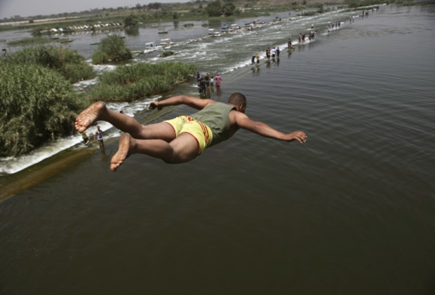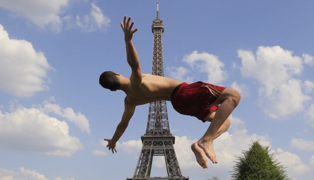 FRANÇA, 19.7.2013. Um rapaz salta numa fonte da praça Trocadero em frente da Torre Eiffel Gonzalo Fuentes/Reuters
