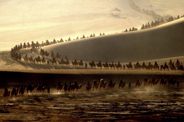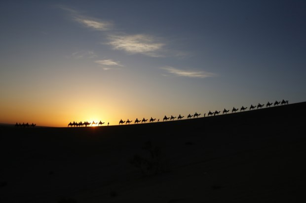 CHINA, 4.10.2013. Turistas em passeio de camelo durante a "semana dourada" chinesa em que o país entra numa semana de férias. No oásis de Mingsha Shan, em Dunhuang Reuters