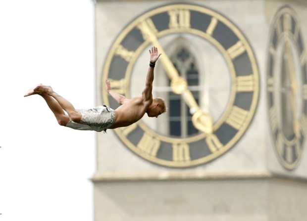 SUÍÇA, 25.7.2013. Um salto de uma plataforma de 10m para o lago Zurique, em Zurique, com a torre do relógio da igreja de S. Pedro ao fundo Arnd Wiegmann/Reuters