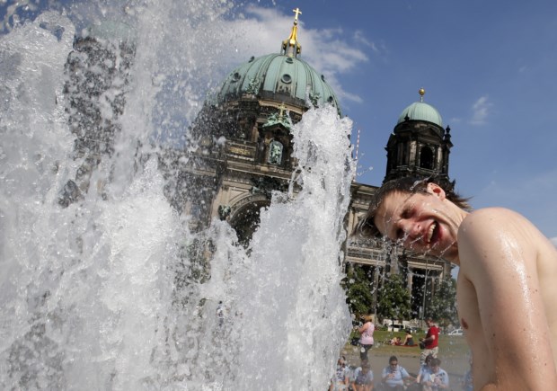 ALEMANHA, 27.7.2013. Frente à Catedral de Berlim, uma turista refresca-se em dia quente de Verão Fabrizio Bensch/Reuters