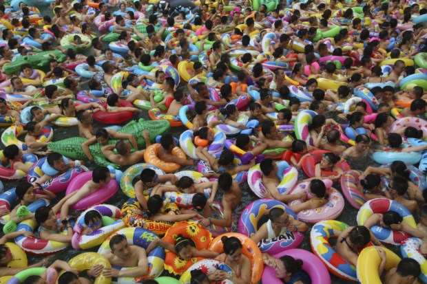CHINA, 27.7.2013. Uma multidão numa piscina de ondas artificiais em Daying China Daily